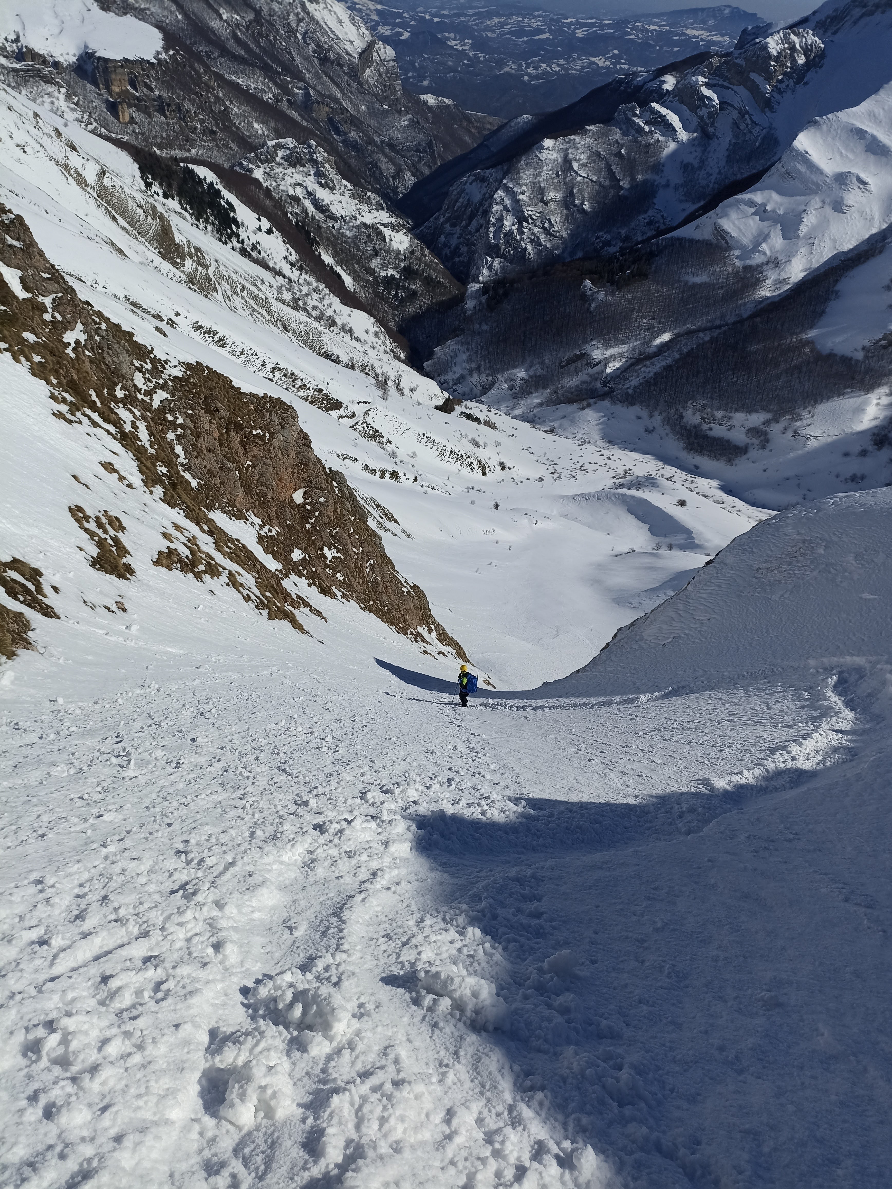 Volendo evitare il traverso si può scendere sciando sino al fondo della valletta, risalendo poi al canale e quindi alla conca.